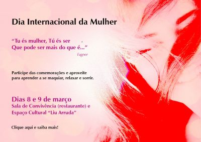 O Núcleo de Qualidade de Vida no Trabalho convida as servidoras do Tribunal de Contas de Mato Grosso para as atividades em comemoração ao Dia Internacional da Mulher nos dias 8 e 9 de março (quinta e sexta).