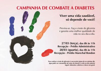 O Tribunal de Contas de Mato Grosso realiza 'Companha contra Diabetes' , nos dias 27 e 28 de março, de 8h às 11h nas recepções dos prédios:Administrativo e Marechal Rondon.