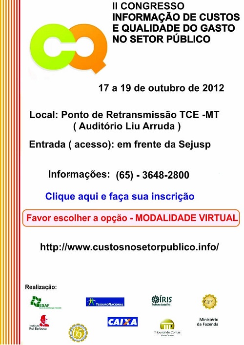 O Conselho Regional de Contabilidade do Mato Grosso (CRCMT) irá transmitir ao vivo via vídeo streaming, o II Congresso Informação de Custos e Qualidade do Gasto no Setor Público que acontecerá nos dias 17, 18 e 19 de outubro em Brasília, destinado a profissionais do setor público, docentes e discentes de instituições de ensino superior de todo o país e entidades do terceiro setor. O local da transmissão será no TCE -Tribunal de Contas do Estado, no auditório Liu Arruda, a partir das 8:30 horas. As inscrições e a programação podem ser feitas pelo link: www.custosnosetorpublico.info